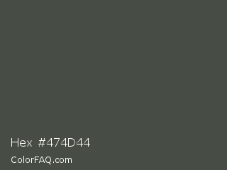 Hex #474d44 Color is a dark green color and the nearest color is Outer Space #414a4c. Hex code #474d44 and RGB value is rgb(71,77,68). In RGB color space, this color is composed of 28% red, 30% green, 27% blue, In CMYK color space, this color is composed of 8% cyan, 0% magenta, 12% yellow , 70% black , In HSL color space, this color has a hue angle of 100° , 6% saturation and 28% lightness.