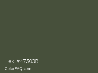 Hex #47503b Color is a dark green color and the nearest color is Rifle Green #444c38. Hex code #47503b and RGB value is rgb(71,80,59). In RGB color space, this color is composed of 28% red, 31% green, 23% blue, In CMYK color space, this color is composed of 11% cyan, 0% magenta, 26% yellow , 69% black , In HSL color space, this color has a hue angle of 86° , 15% saturation and 27% lightness.