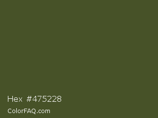 Hex #475228 Color is a dark lime color and the nearest color is Woodland #4d5328. Hex code #475228 and RGB value is rgb(71,82,40). In RGB color space, this color is composed of 28% red, 32% green, 16% blue, In CMYK color space, this color is composed of 13% cyan, 0% magenta, 51% yellow , 68% black , In HSL color space, this color has a hue angle of 76° , 34% saturation and 24% lightness.