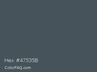 Hex #47535b Color is a normal blue color and the nearest color is Trout #4a4e5a. Hex code #47535b and RGB value is rgb(71,83,91). In RGB color space, this color is composed of 28% red, 33% green, 36% blue, In CMYK color space, this color is composed of 22% cyan, 9% magenta, 0% yellow , 64% black , In HSL color space, this color has a hue angle of 204° , 12% saturation and 32% lightness.