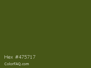 Hex #475717 Color is a very dark lime color and the nearest color is Army Green #4b5320. Hex code #475717 and RGB value is rgb(71,87,23). In RGB color space, this color is composed of 28% red, 34% green, 9% blue, In CMYK color space, this color is composed of 18% cyan, 0% magenta, 74% yellow , 66% black , In HSL color space, this color has a hue angle of 75° , 58% saturation and 22% lightness.