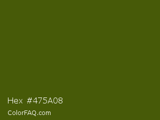 Hex #475a08 Color is a very dark lime color and the nearest color is Verdun Green #495400. Hex code #475a08 and RGB value is rgb(71,90,8). In RGB color space, this color is composed of 28% red, 35% green, 3% blue, In CMYK color space, this color is composed of 21% cyan, 0% magenta, 91% yellow , 65% black , In HSL color space, this color has a hue angle of 74° , 84% saturation and 19% lightness.
