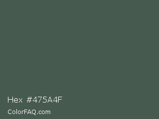 Hex #475a4f Color is a normal green color and the nearest color is Nandor #4b5d52. Hex code #475a4f and RGB value is rgb(71,90,79). In RGB color space, this color is composed of 28% red, 35% green, 31% blue, In CMYK color space, this color is composed of 21% cyan, 0% magenta, 12% yellow , 65% black , In HSL color space, this color has a hue angle of 145° , 12% saturation and 32% lightness.