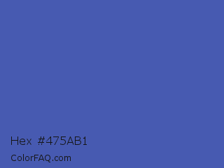 Hex #475ab1 Color is a normal blue color and the nearest color is Liberty #545aa7. Hex code #475ab1 and RGB value is rgb(71,90,177). In RGB color space, this color is composed of 28% red, 35% green, 69% blue, In CMYK color space, this color is composed of 60% cyan, 49% magenta, 0% yellow , 31% black , In HSL color space, this color has a hue angle of 229° , 43% saturation and 49% lightness.