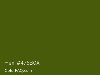 Hex #475b0a Color is a very dark lime color and the nearest color is Verdun Green #495400. Hex code #475b0a and RGB value is rgb(71,91,10). In RGB color space, this color is composed of 28% red, 36% green, 4% blue, In CMYK color space, this color is composed of 22% cyan, 0% magenta, 89% yellow , 64% black , In HSL color space, this color has a hue angle of 75° , 80% saturation and 20% lightness.