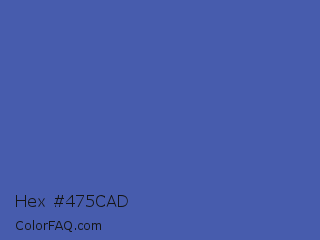 Hex #475cad Color is a normal blue color and the nearest color is Liberty #545aa7. Hex code #475cad and RGB value is rgb(71,92,173). In RGB color space, this color is composed of 28% red, 36% green, 68% blue, In CMYK color space, this color is composed of 59% cyan, 47% magenta, 0% yellow , 32% black , In HSL color space, this color has a hue angle of 228° , 42% saturation and 48% lightness.