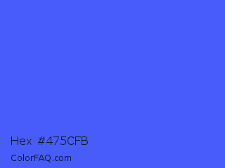 Hex #475cfb Color is a light blue color and the nearest color is Ultramarine Blue #4166f5. Hex code #475cfb and RGB value is rgb(71,92,251). In RGB color space, this color is composed of 28% red, 36% green, 98% blue, In CMYK color space, this color is composed of 72% cyan, 63% magenta, 0% yellow , 2% black , In HSL color space, this color has a hue angle of 233° , 96% saturation and 63% lightness.
