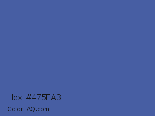 Hex #475ea3 Color is a normal blue color and the nearest color is Liberty #545aa7. Hex code #475ea3 and RGB value is rgb(71,94,163). In RGB color space, this color is composed of 28% red, 37% green, 64% blue, In CMYK color space, this color is composed of 56% cyan, 42% magenta, 0% yellow , 36% black , In HSL color space, this color has a hue angle of 225° , 39% saturation and 46% lightness.