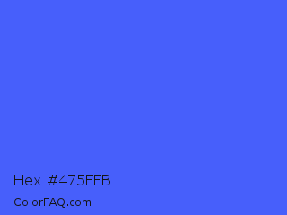 Hex #475ffb Color is a light blue color and the nearest color is Ultramarine Blue #4166f5. Hex code #475ffb and RGB value is rgb(71,95,251). In RGB color space, this color is composed of 28% red, 37% green, 98% blue, In CMYK color space, this color is composed of 72% cyan, 62% magenta, 0% yellow , 2% black , In HSL color space, this color has a hue angle of 232° , 96% saturation and 63% lightness.