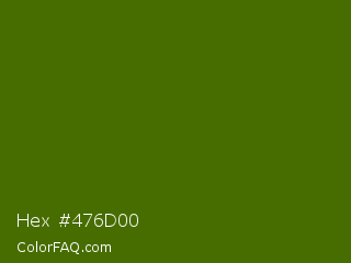 Hex #476d00 Color is a very dark green color and the nearest color is Green Leaf #436a0d. Hex code #476d00 and RGB value is rgb(71,109,0). In RGB color space, this color is composed of 28% red, 43% green, 0% blue, In CMYK color space, this color is composed of 35% cyan, 0% magenta, 100% yellow , 57% black , In HSL color space, this color has a hue angle of 81° , 100% saturation and 21% lightness.