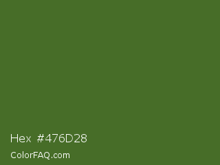Hex #476d28 Color is a dark green color and the nearest color is Dark Olive Green #556b2f. Hex code #476d28 and RGB value is rgb(71,109,40). In RGB color space, this color is composed of 28% red, 43% green, 16% blue, In CMYK color space, this color is composed of 35% cyan, 0% magenta, 63% yellow , 57% black , In HSL color space, this color has a hue angle of 93° , 46% saturation and 29% lightness.