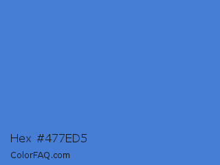 Hex #477ed5 Color is a normal blue color and the nearest color is Han Blue #446ccf. Hex code #477ed5 and RGB value is rgb(71,126,213). In RGB color space, this color is composed of 28% red, 49% green, 84% blue, In CMYK color space, this color is composed of 67% cyan, 41% magenta, 0% yellow , 16% black , In HSL color space, this color has a hue angle of 217° , 63% saturation and 56% lightness.