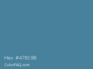 Hex #47819b Color is a normal blue color and the nearest color is Wedgewood #4e7f9e. Hex code #47819b and RGB value is rgb(71,129,155). In RGB color space, this color is composed of 28% red, 51% green, 61% blue, In CMYK color space, this color is composed of 54% cyan, 17% magenta, 0% yellow , 39% black , In HSL color space, this color has a hue angle of 199° , 37% saturation and 44% lightness.