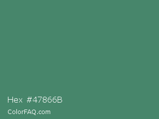 Hex #47866b Color is a normal green color and the nearest color is Viridian #40826d. Hex code #47866b and RGB value is rgb(71,134,107). In RGB color space, this color is composed of 28% red, 53% green, 42% blue, In CMYK color space, this color is composed of 47% cyan, 0% magenta, 20% yellow , 47% black , In HSL color space, this color has a hue angle of 154° , 31% saturation and 40% lightness.