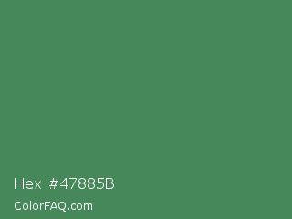 Hex #47885b Color is a normal green color and the nearest color is Middle Green #4d8c57. Hex code #47885b and RGB value is rgb(71,136,91). In RGB color space, this color is composed of 28% red, 53% green, 36% blue, In CMYK color space, this color is composed of 48% cyan, 0% magenta, 33% yellow , 47% black , In HSL color space, this color has a hue angle of 138° , 31% saturation and 41% lightness.
