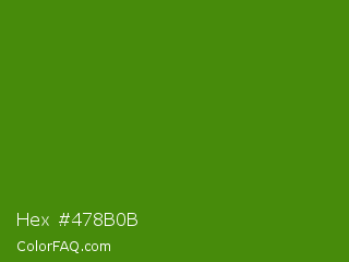 Hex #478b0b Color is a dark green color and the nearest color is Avocado #568203. Hex code #478b0b and RGB value is rgb(71,139,11). In RGB color space, this color is composed of 28% red, 55% green, 4% blue, In CMYK color space, this color is composed of 49% cyan, 0% magenta, 92% yellow , 45% black , In HSL color space, this color has a hue angle of 92° , 85% saturation and 29% lightness.