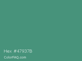 Hex #47937b Color is a normal green color and the nearest color is Wintergreen Dream #56887d. Hex code #47937b and RGB value is rgb(71,147,123). In RGB color space, this color is composed of 28% red, 58% green, 48% blue, In CMYK color space, this color is composed of 52% cyan, 0% magenta, 16% yellow , 42% black , In HSL color space, this color has a hue angle of 161° , 35% saturation and 43% lightness.