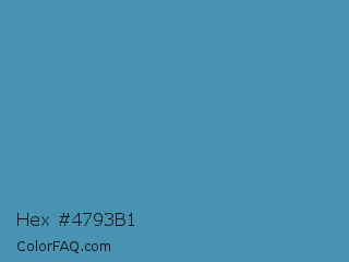 Hex #4793b1 Color is a normal blue color and the nearest color is Boston Blue #3b91b4. Hex code #4793b1 and RGB value is rgb(71,147,177). In RGB color space, this color is composed of 28% red, 58% green, 69% blue, In CMYK color space, this color is composed of 60% cyan, 17% magenta, 0% yellow , 31% black , In HSL color space, this color has a hue angle of 197° , 43% saturation and 49% lightness.