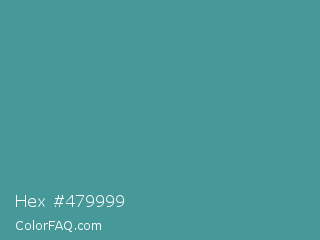 Hex #479999 Color is a normal cyan color and the nearest color is Zomp #39a78e. Hex code #479999 and RGB value is rgb(71,153,153). In RGB color space, this color is composed of 28% red, 60% green, 60% blue, In CMYK color space, this color is composed of 54% cyan, 0% magenta, 0% yellow , 40% black , In HSL color space, this color has a hue angle of 180° , 37% saturation and 44% lightness.