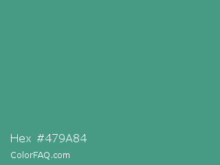 Hex #479a84 Color is a normal cyan color and the nearest color is Ocean Green #41aa78. Hex code #479a84 and RGB value is rgb(71,154,132). In RGB color space, this color is composed of 28% red, 60% green, 52% blue, In CMYK color space, this color is composed of 54% cyan, 0% magenta, 14% yellow , 40% black , In HSL color space, this color has a hue angle of 164° , 37% saturation and 44% lightness.