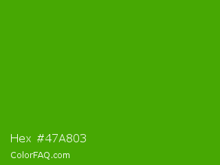 Hex #47a803 Color is a normal green color and the nearest color is Kelly Green #4cbb17. Hex code #47a803 and RGB value is rgb(71,168,3). In RGB color space, this color is composed of 28% red, 66% green, 1% blue, In CMYK color space, this color is composed of 58% cyan, 0% magenta, 98% yellow , 34% black , In HSL color space, this color has a hue angle of 95° , 96% saturation and 34% lightness.