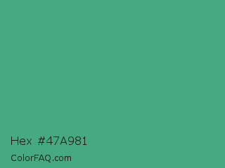 Hex #47a981 Color is a normal green color and the nearest color is Ocean Green #41aa78. Hex code #47a981 and RGB value is rgb(71,169,129). In RGB color space, this color is composed of 28% red, 66% green, 51% blue, In CMYK color space, this color is composed of 58% cyan, 0% magenta, 24% yellow , 34% black , In HSL color space, this color has a hue angle of 156° , 41% saturation and 47% lightness.