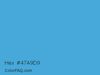Hex #47a9d9 Color is a normal blue color and the nearest color is Shakespeare #4eabd1. Hex code #47a9d9 and RGB value is rgb(71,169,217). In RGB color space, this color is composed of 28% red, 66% green, 85% blue, In CMYK color space, this color is composed of 67% cyan, 22% magenta, 0% yellow , 15% black , In HSL color space, this color has a hue angle of 200° , 66% saturation and 56% lightness.