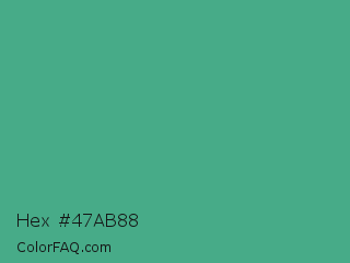 Hex #47ab88 Color is a normal green color and the nearest color is Mint #3eb489. Hex code #47ab88 and RGB value is rgb(71,171,136). In RGB color space, this color is composed of 28% red, 67% green, 53% blue, In CMYK color space, this color is composed of 58% cyan, 0% magenta, 20% yellow , 33% black , In HSL color space, this color has a hue angle of 159° , 41% saturation and 47% lightness.