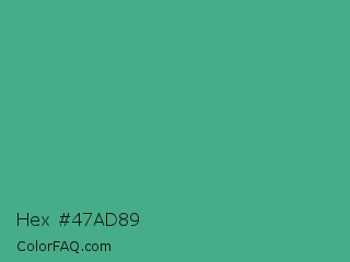 Hex #47ad89 Color is a normal green color and the nearest color is Mint #3eb489. Hex code #47ad89 and RGB value is rgb(71,173,137). In RGB color space, this color is composed of 28% red, 68% green, 54% blue, In CMYK color space, this color is composed of 59% cyan, 0% magenta, 21% yellow , 32% black , In HSL color space, this color has a hue angle of 159° , 42% saturation and 48% lightness.