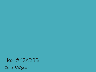 Hex #47adbb Color is a normal cyan color and the nearest color is Pelorous #3eabbf. Hex code #47adbb and RGB value is rgb(71,173,187). In RGB color space, this color is composed of 28% red, 68% green, 73% blue, In CMYK color space, this color is composed of 62% cyan, 7% magenta, 0% yellow , 27% black , In HSL color space, this color has a hue angle of 187° , 46% saturation and 51% lightness.