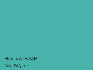 Hex #47b3ab Color is a normal cyan color and the nearest color is Verdigris #43b3ae. Hex code #47b3ab and RGB value is rgb(71,179,171). In RGB color space, this color is composed of 28% red, 70% green, 67% blue, In CMYK color space, this color is composed of 60% cyan, 0% magenta, 4% yellow , 30% black , In HSL color space, this color has a hue angle of 176° , 43% saturation and 49% lightness.