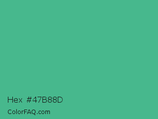 Hex #47b88d Color is a normal green color and the nearest color is Ocean Green #48bf91. Hex code #47b88d and RGB value is rgb(71,184,141). In RGB color space, this color is composed of 28% red, 72% green, 55% blue, In CMYK color space, this color is composed of 61% cyan, 0% magenta, 23% yellow , 28% black , In HSL color space, this color has a hue angle of 157° , 44% saturation and 50% lightness.