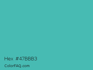 Hex #47bbb3 Color is a normal cyan color and the nearest color is Verdigris #43b3ae. Hex code #47bbb3 and RGB value is rgb(71,187,179). In RGB color space, this color is composed of 28% red, 73% green, 70% blue, In CMYK color space, this color is composed of 62% cyan, 0% magenta, 4% yellow , 27% black , In HSL color space, this color has a hue angle of 176° , 46% saturation and 51% lightness.