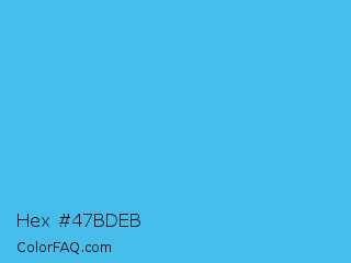 Hex #47bdeb Color is a normal blue color and the nearest color is Picton Blue #45b1e8. Hex code #47bdeb and RGB value is rgb(71,189,235). In RGB color space, this color is composed of 28% red, 74% green, 92% blue, In CMYK color space, this color is composed of 70% cyan, 20% magenta, 0% yellow , 8% black , In HSL color space, this color has a hue angle of 197° , 80% saturation and 60% lightness.
