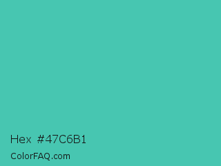 Hex #47c6b1 Color is a normal cyan color and the nearest color is Puerto Rico #3fc1aa. Hex code #47c6b1 and RGB value is rgb(71,198,177). In RGB color space, this color is composed of 28% red, 78% green, 69% blue, In CMYK color space, this color is composed of 64% cyan, 0% magenta, 11% yellow , 22% black , In HSL color space, this color has a hue angle of 170° , 53% saturation and 53% lightness.