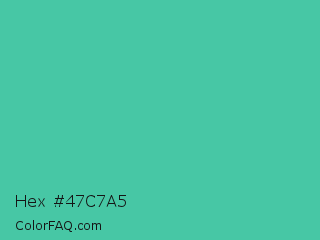 Hex #47c7a5 Color is a normal cyan color and the nearest color is Puerto Rico #3fc1aa. Hex code #47c7a5 and RGB value is rgb(71,199,165). In RGB color space, this color is composed of 28% red, 78% green, 65% blue, In CMYK color space, this color is composed of 64% cyan, 0% magenta, 17% yellow , 22% black , In HSL color space, this color has a hue angle of 164° , 53% saturation and 53% lightness.