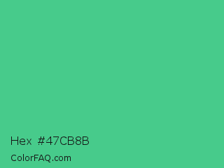 Hex #47cb8b Color is a normal green color and the nearest color is Ocean Green #48bf91. Hex code #47cb8b and RGB value is rgb(71,203,139). In RGB color space, this color is composed of 28% red, 80% green, 55% blue, In CMYK color space, this color is composed of 65% cyan, 0% magenta, 32% yellow , 20% black , In HSL color space, this color has a hue angle of 151° , 56% saturation and 54% lightness.