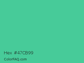 Hex #47cb99 Color is a normal green color and the nearest color is Ocean Green #48bf91. Hex code #47cb99 and RGB value is rgb(71,203,153). In RGB color space, this color is composed of 28% red, 80% green, 60% blue, In CMYK color space, this color is composed of 65% cyan, 0% magenta, 25% yellow , 20% black , In HSL color space, this color has a hue angle of 157° , 56% saturation and 54% lightness.