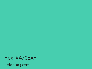 Hex #47ceaf Color is a normal cyan color and the nearest color is Eucalyptus #44d7a8. Hex code #47ceaf and RGB value is rgb(71,206,175). In RGB color space, this color is composed of 28% red, 81% green, 69% blue, In CMYK color space, this color is composed of 66% cyan, 0% magenta, 15% yellow , 19% black , In HSL color space, this color has a hue angle of 166° , 58% saturation and 54% lightness.
