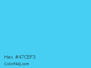Hex #47cef3 Color is a light cyan color and the nearest color is Picton Blue #45b1e8. Hex code #47cef3 and RGB value is rgb(71,206,243). In RGB color space, this color is composed of 28% red, 81% green, 95% blue, In CMYK color space, this color is composed of 71% cyan, 15% magenta, 0% yellow , 5% black , In HSL color space, this color has a hue angle of 193° , 88% saturation and 62% lightness.
