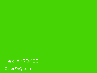 Hex #47d405 Color is a normal green color and the nearest color is Harlequin Green #46cb18. Hex code #47d405 and RGB value is rgb(71,212,5). In RGB color space, this color is composed of 28% red, 83% green, 2% blue, In CMYK color space, this color is composed of 67% cyan, 0% magenta, 98% yellow , 17% black , In HSL color space, this color has a hue angle of 101° , 95% saturation and 43% lightness.