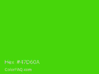 Hex #47d60a Color is a normal green color and the nearest color is Harlequin Green #46cb18. Hex code #47d60a and RGB value is rgb(71,214,10). In RGB color space, this color is composed of 28% red, 84% green, 4% blue, In CMYK color space, this color is composed of 67% cyan, 0% magenta, 95% yellow , 16% black , In HSL color space, this color has a hue angle of 102° , 91% saturation and 44% lightness.