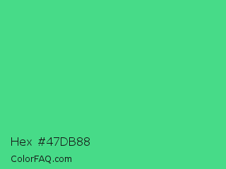 Hex #47db88 Color is a normal green color and the nearest color is Emerald #50c878. Hex code #47db88 and RGB value is rgb(71,219,136). In RGB color space, this color is composed of 28% red, 86% green, 53% blue, In CMYK color space, this color is composed of 68% cyan, 0% magenta, 38% yellow , 14% black , In HSL color space, this color has a hue angle of 146° , 67% saturation and 57% lightness.