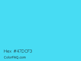 Hex #47dcf3 Color is a light cyan color and the nearest color is Turquoise #40e0d0. Hex code #47dcf3 and RGB value is rgb(71,220,243). In RGB color space, this color is composed of 28% red, 86% green, 95% blue, In CMYK color space, this color is composed of 71% cyan, 9% magenta, 0% yellow , 5% black , In HSL color space, this color has a hue angle of 188° , 88% saturation and 62% lightness.
