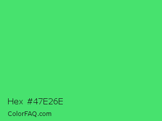 Hex #47e26e Color is a normal green color and the nearest color is UFO Green #3cd070. Hex code #47e26e and RGB value is rgb(71,226,110). In RGB color space, this color is composed of 28% red, 89% green, 43% blue, In CMYK color space, this color is composed of 69% cyan, 0% magenta, 51% yellow , 11% black , In HSL color space, this color has a hue angle of 135° , 73% saturation and 58% lightness.