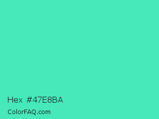 Hex #47e8ba Color is a normal green color and the nearest color is Turquoise #40e0d0. Hex code #47e8ba and RGB value is rgb(71,232,186). In RGB color space, this color is composed of 28% red, 91% green, 73% blue, In CMYK color space, this color is composed of 69% cyan, 0% magenta, 20% yellow , 9% black , In HSL color space, this color has a hue angle of 163° , 78% saturation and 59% lightness.