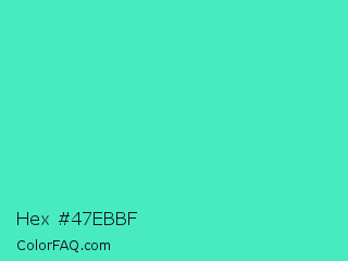 Hex #47ebbf Color is a normal cyan color and the nearest color is Turquoise #40e0d0. Hex code #47ebbf and RGB value is rgb(71,235,191). In RGB color space, this color is composed of 28% red, 92% green, 75% blue, In CMYK color space, this color is composed of 70% cyan, 0% magenta, 19% yellow , 8% black , In HSL color space, this color has a hue angle of 164° , 80% saturation and 60% lightness.