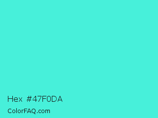 Hex #47f0da Color is a light cyan color and the nearest color is Turquoise #40e0d0. Hex code #47f0da and RGB value is rgb(71,240,218). In RGB color space, this color is composed of 28% red, 94% green, 85% blue, In CMYK color space, this color is composed of 70% cyan, 0% magenta, 9% yellow , 6% black , In HSL color space, this color has a hue angle of 172° , 85% saturation and 61% lightness.