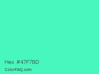 Hex #47f7bd Color is a light green color and the nearest color is Turquoise #40e0d0. Hex code #47f7bd and RGB value is rgb(71,247,189). In RGB color space, this color is composed of 28% red, 97% green, 74% blue, In CMYK color space, this color is composed of 71% cyan, 0% magenta, 23% yellow , 3% black , In HSL color space, this color has a hue angle of 160° , 92% saturation and 62% lightness.