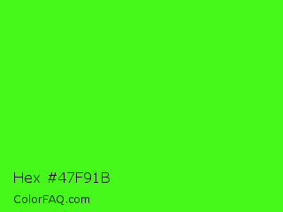 Hex #47f91b Color is a normal green color and the nearest color is Neon Green #39ff14. Hex code #47f91b and RGB value is rgb(71,249,27). In RGB color space, this color is composed of 28% red, 98% green, 11% blue, In CMYK color space, this color is composed of 71% cyan, 0% magenta, 89% yellow , 2% black , In HSL color space, this color has a hue angle of 108° , 95% saturation and 54% lightness.